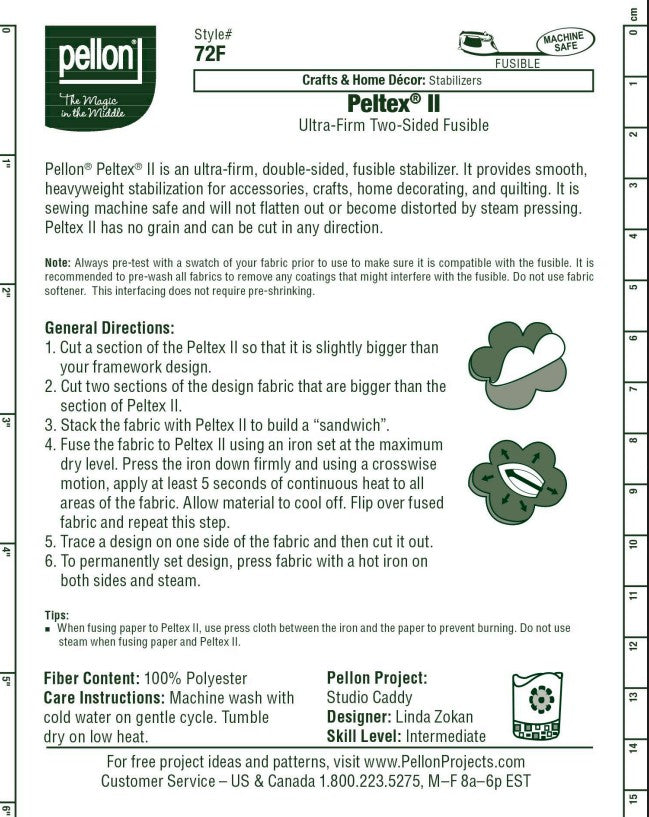 Pellon® 72F Peltex® II Two-Sided Fusible is an ultra-firm, double-sided fusible stabilizer. It provides smooth, heavyweight stabilization for accessories, crafts, home decorating, and quilting. It is sewing machine safe and will not flatten out or become distorted with steam pressing. Peltex® II has no grain and can be cut in any direction.