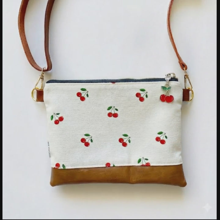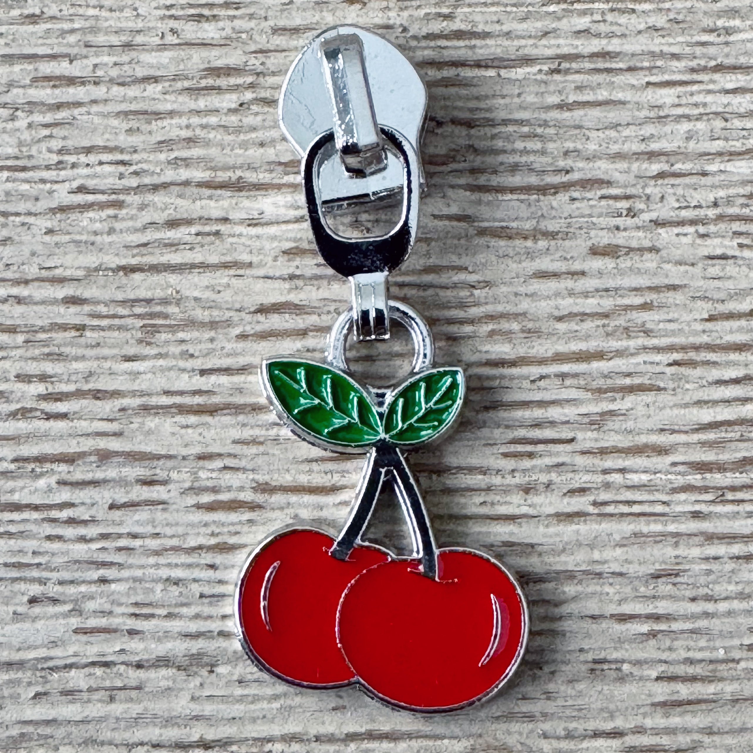 Red Cherry with green leaves on Silver finish, double-sided zipper pulls.